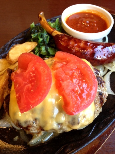 「デミグラスハンバーグは後で食べるからカリビアンにしましょう。上のトマトはフレッシュなんですね。アツアツのハンバーグ、チーズとのコントラストがいい感じです。」