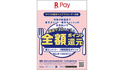 楽天カードと組み合わせて便利でお得な楽天ペイメントのスマートフォン(スマホ)決済サービス「楽天ペイ(アプリ決済)」は、条件を満たした中から抽選で30人に1人、楽天ポイント(期間限定)で最大1000ポイントまで還元する「楽天ポイントで食べて応援!抽選で必ず30人に1人全額相当楽天ポイント還元キャンペーン!」を開始した。期間は6月14日10時~7月31日23時59分。