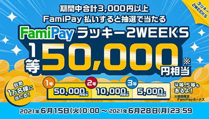ファミリーマートは、ファミリーマートを含む「FamiPay」が使える店舗・オンラインショップで合計3000円以上、バーコード決済機能付きの公式アプリ「ファミペイ」内の決済機能「FamiPay」で支払うと抽選で最大5万円相当の期間限定FamiPayボーナスをプレゼントする「FamiPay ラッキー2WEEKSキャンペーン」を開始した。キャンペーン期間は、6月15日0時~6月28日23時59分の2週間。