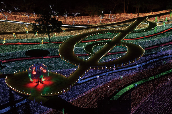 国内最大級の規模を誇る壮大なイルミネーション。「あじさい・花しょうぶ園」では今年のテーマ“大自然”を表現した神秘的な光の演出が。光のトンネル『アーチングイルミネーション華回廊』は「河津桜」をイメージしたリニューアルバージョンに!
