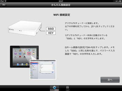 Wi-Fiの設定をしたら、アプリを起動します。「かんたん接続設定」で、「デジタルTVチューナー」の電源、アンテナケーブル、LANケーブルなどを正しく接続します。