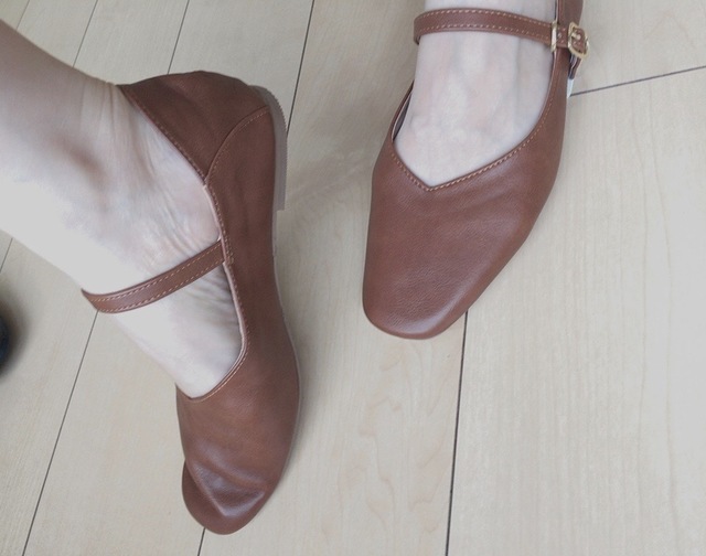ブラウン(商品タグでは濃肌色となっていました)の足先がスクエア状の、個性的な形のぺたんこ靴です。