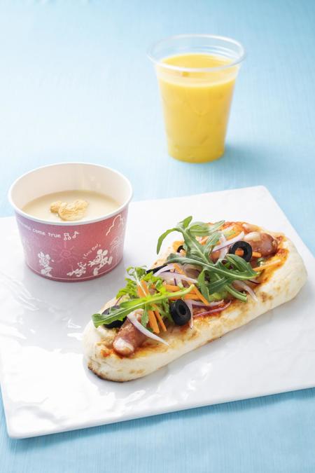 メキシカンナンドッグ、冷製豆乳コーンスープ、ソフトドリンクのセットです。