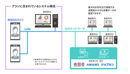 顔認証で記録した個人ID、時刻、温度測定などのデータは、現在企業で使っているOBCやAMANO、ジョブカンの勤怠管理ソフトや給与計算ソフトなどと連携が可能。管理業務のスリム化を実現する。
