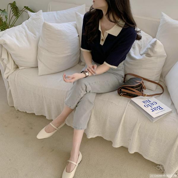 今人気があるのは、シンプルな白い襟つきの半袖ニット、配色カラーニット(¥2680)。