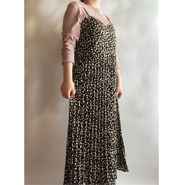 レオパード柄でも水玉のような感じ、可愛らしく着られます。黒系を選んでみましたが、嬉しい着痩せ効果もありました。