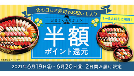 ライドオンエクスプレスホールディングスが運営する宅配寿司「銀のさら」は、6月19日~20日の2日間限定で、「父の日デリポイント半額還元」キャンペーンを開催する。