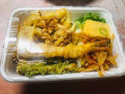 今回は、エビ天、ちくわ天、かきあげがのっているお弁当を頼みました。