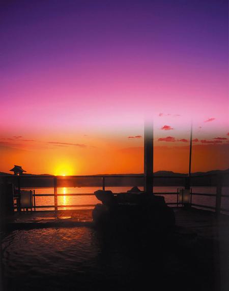全国でもここにしかない湖上露天風呂。東郷湖の湖面にタ日が映る幻想的な光景の中でゆったりと入浴を。