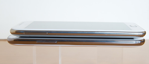 厚さ比較。上が「GALAXY Note」、下が「GALAXY Note II」。厚さは「GALAXY Note」が約9.7mm、「GALAXY Note II」も約9.7mmでほとんど変わらない。 拡大画像表示