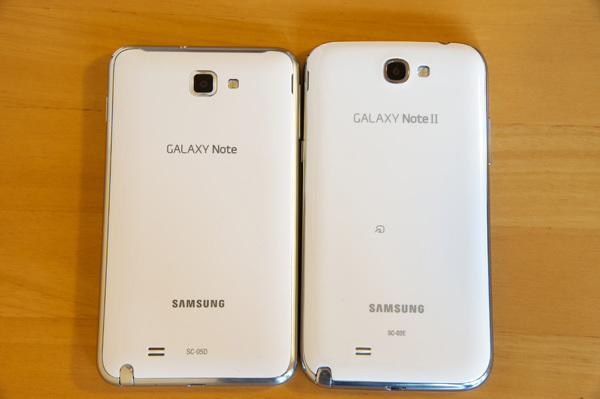 背面から。やはり「GALAXY Note II」のほうが縦に長いのがわかる。右側の「GALAXY Note II」にはFeliCaマークも付いており、おサイフケータイにも対応。 拡大画像表示