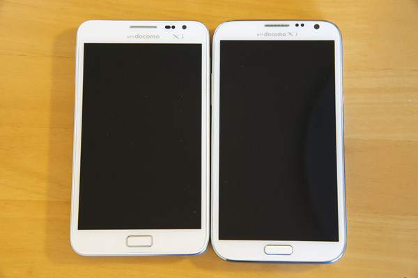 左が「GALAXY Note」、右が「GALAXY Note II」。画面サイズが縦長になっていることがわかる。その分「GALAXY Note II」のほうが横幅が狭い。 拡大画像表示
