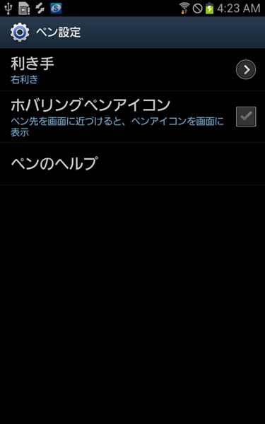 「GALAXY Note」のペン設定画面。設定項目は少なめ。 拡大画像表示