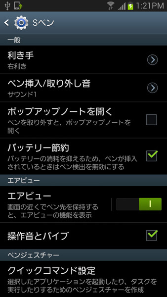 「GALAXY Note II」の「Sペン」設定画面は設定項目が大幅に増えている。ペンをもっと使いたいという人は「GALAXY Note II」のほうが向いているだろう。 拡大画像表示