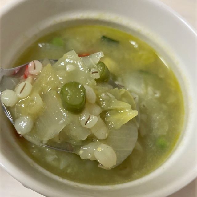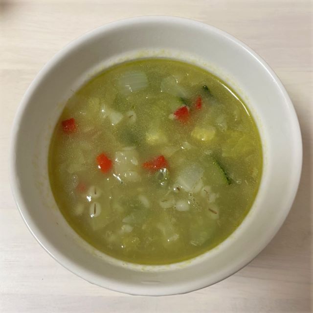 野菜の他には麦が入っていて、プチプチとした食感が楽しめるスープになっています。
