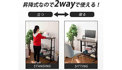 スタンディングデスクとは、その名の通り、PCなどで仕事をする際、立ったままでも使える昇降式のデスクのこと。特に気になっていたのが、アマゾンに株式会社真善美が出品している商品(図参照)で、幅91.5cm×奥行51cm×高さ約81.5~124.5cmのものが2万3990円、幅58cm×奥行43cm×高さ約76~120cmのものが1万2000円と2種類がある。PC以外にも資料を手元に置くには、やはり幅は広い方がいいだろう。