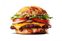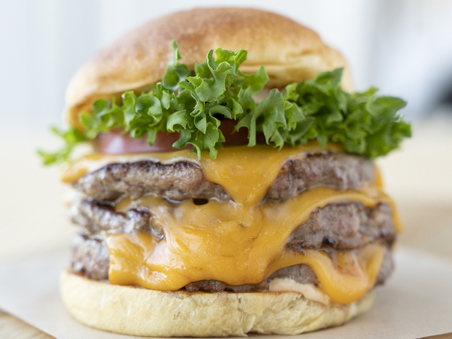 3層のふっくらもっちり食感のバンズに、溢れる肉汁ジューシーなパティが2枚、新鮮な生野菜(トマト・レタス)をはさんだ2段のハンバーガーとなっています。