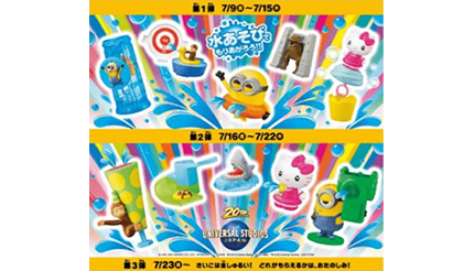 第1弾(7月9日~15日)としては、上から水を注ぐとケビンの付いた水車が勢いよく回る「ミニオン ケビンの回転水車」、中に水を入れて背中のボタンを押すとボブの浮き輪に開いた穴から水が出る「ミニオン うきわのボブの水でっぽう」、ゲートの上から水を注ぐとT-レックスのアゴが閉じて下からシャワーのように水が出てくる「ジュラシックワールド T-レックスとゲートシャワー」、USJ限定のおめかしをしたハローキティのおもちゃ「ハローキティのシャボン玉」、中に水を入れてジョージを押すとアヒルの口から水が出る「おさるのジョージの水でっぽう」の5アイテムを展開する。