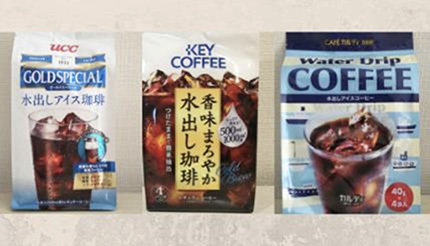 今回は「ucc ゴールドスペシャル コーヒーバッグ 水出しアイス珈琲」「KEY COFFEE 香味まろやか水出し珈琲」「カフェカルディ ウォータードリップコーヒー」を試した。価格は全て500円以下。カフェカルディ以外は、比較的入手しやすいだろう。