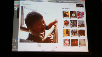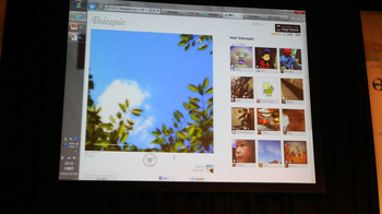 「Voicepic」とは、静止画の写真に音声をつけて、簡単に家族や友達と共有できるサービス。非常にシンプルでわかりやすいインタフェースと快適さを追求したとのこと。