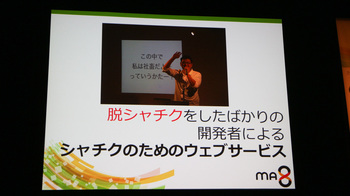今後は、位置情報偽装アリバイ機能などを予定しているとか。開発者のひさじゅ氏も、ツナギを着たプレゼンで場を盛り上げました。