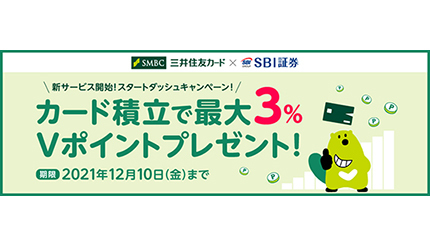 三井住友カードは、新サービス「三井住友カードつみたて投資」の提供にあわせ、カード種類に応じて積立額の最大3%のVポイントがたまる「【SBI証券】カード積立で最大3%Vポイントプレゼント!スタートダッシュキャンペーン!」を実施する。
