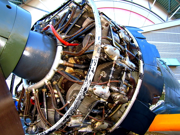 息を吹き返した栄二一型空冷複列星型14気筒エンジン(中島飛行機製)は、プロペラの周りを円を描くように空冷エンジンが14個並んでいます。オートバイのエンジンなどに似たジャバラの筐体がきれいに並んでいるのが見えます。