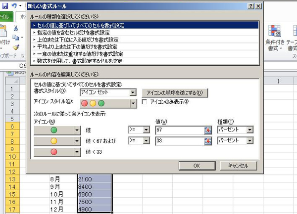 1)セル範囲を指定し、「条件付き書式」→「アイコンセット」を選択します。