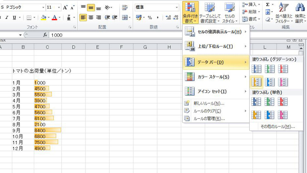 1)セル範囲を指定し、「セルの強調表示ルール」→「データバー」を選択します。