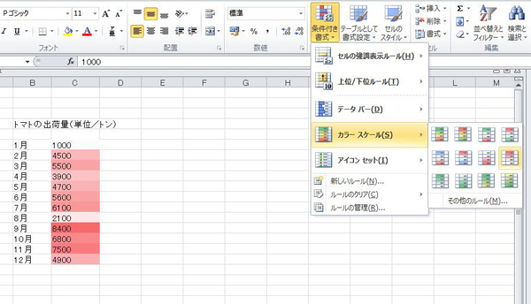 1)セル範囲を指定し、「条件付き書式」→「カラースケール」を選択します。