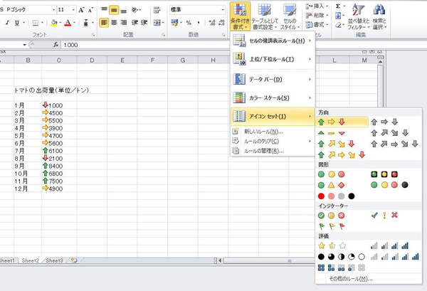 2)「方向」「図形」「インジケーター」「評価」などから好みの形式を選ぶと、数値の大きさによってセル内にアイコンが表示されます。