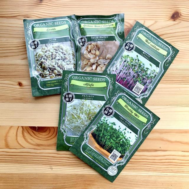 おすすめの種は、オーガニックのスプラウト種セットです。カイワレ系・もやし系のスプラウト12種類から5種類を選ぶことができます。