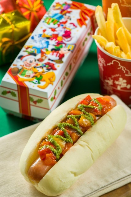 ラタトゥイユとバジルソースを使ったクリスマスカラーで彩られたホットドッグです。