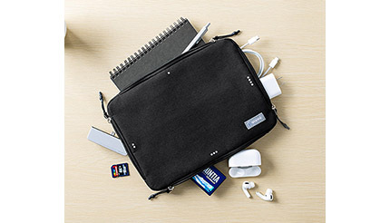 7~8インチ程度のタブレット端末、マウスやイヤホンなどの周辺機器、メモ帳や文具、充電器やケーブルなどを、それぞれ分別して収納整理することが可能で、ポケットが小分けにされているため、さまざまなガジェットを収納しても薄い形を保ったまま使える。また、ポケット間の仕切りはクッションを備えており、各ポケットのファスナーにストラップが付き、開け閉めしやすい。