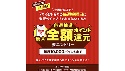 楽天ペイメントは、対象日に楽天ペイアプリで決済すると抽選で最大1万ポイントが当たる3カ月連続のキャンペーン「Rakuten Pay Friday!毎週金曜日は全国のお店で最大全額抽選キャンペーン!」を7月1日から9月30日まで実施している。
