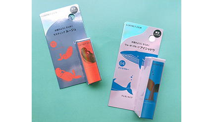 今回はルージュとシャドウから1カラーずつ購入してみた。どちらも一般的なコスメよりも小ぶりのサイズ。なんといっても夏らしいラッコとクジラの愛くるしいパッケージに心惹かれる。それぞれ、複数のカラーが販売されているためお気に入りのパッケージ×カラーを楽しんでほしい。