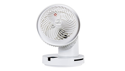 新製品は、放射状の首振りと直径20cmの羽根による大風量で、床や天井にたまった暖気や冷気を効率よく循環させエアコンの効率アップや換気に役立つ。