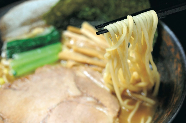 香ばしくて甘い風味を感じる焙煎小麦をブレンドした麺。伸びにくく改良した麺は加水率を低くして歯切れのいいシコシコの食感に仕上げた。