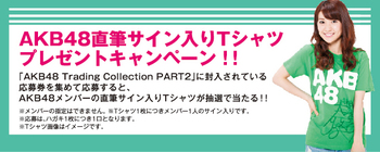 さらにBOX購入者限定特典として、「スペシャルプロモーションカード(13種類)」が、1BOXにつきランダムに1枚封入されます。ううむ……これ、フルコンプを達成するには相当長い道のりとなりそうです。だがそれがいい! それでこそトレカ魂が燃え上がるってもんです。封入された応募券を集めて応募すると、AKB48メンバーの直筆サイン入りTシャツが抽選で当たるキャンペーンも実施されますよ。