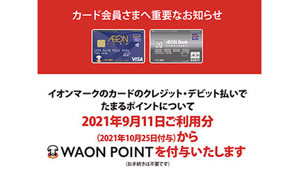 イオンカードは、クレジット/デビットカードの利用額に応じて付与していた「ときめきポイント」の付与を終了し、WAON POINTを付与する。変更は2021年9月11日分以降。初回の付与は10月25日となる。保有するときめきポイントは、有効期限内で引き続き利用できる。
