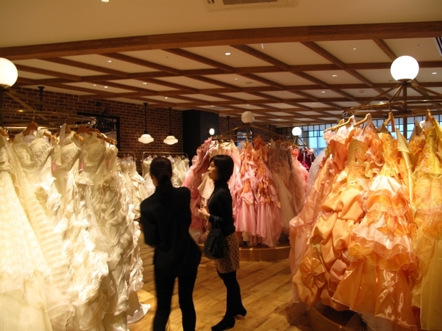 「白いドレスはシンプルなもので、極力飾りのないもの希望です。可愛過ぎるのは苦手なので…」という筆者のリクエストに対し、スッキリしたデザインのドレスを集めたコーナーへ、スタッフが連れて行ってくれます。そこで気になるものを2点チョイス。さらにカラードレスも選びました。「白いドレスとは思いっきりイメージの変わるものを」とお願いすると、オレンジとブルーのゴージャスなドレスをお勧めされ、結果的にブルーを選択。