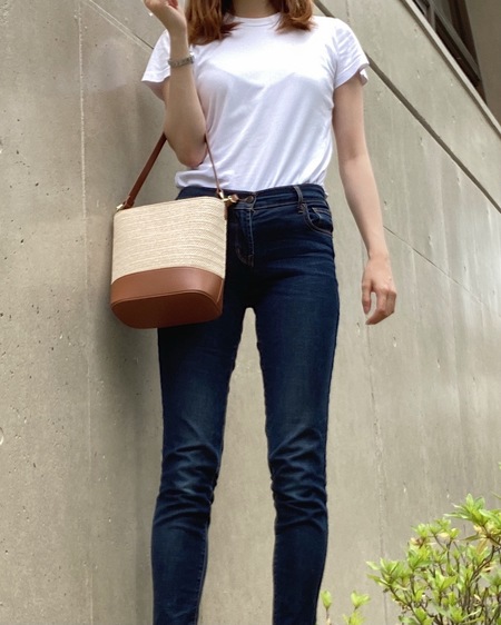 シンプルなTシャツコーデも、季節感たっぷりのカゴバッグが入ることで、一気に夏らしい印象になります。