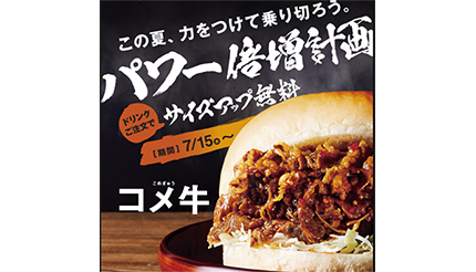 コメダ珈琲店を展開するコメダは7月15日から、バーガーの牛カルビ肉の量が並(具110g)、肉だく(具2倍の220g)、肉だくだく(具3倍の330g)の3種類から選べる「コメ牛」を季節限定で販売する。販売を記念して7月15日~8月1日の期間、「パワー倍増計画」と題して、ドリンク一杯の注文でコメ牛のサイズアップを無料で提供する「コメ牛サイズアップ無料キャンペーン」を実施する。