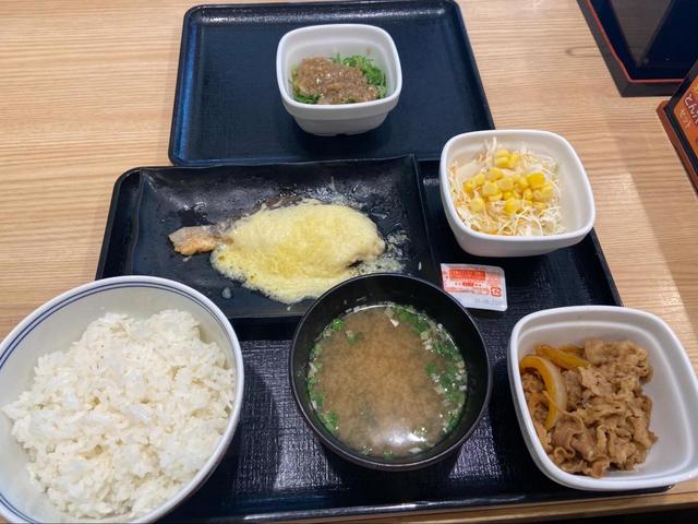 最後は、「焼魚牛小鉢定食」に「チーズ」と「青ねぎ塩」をトッピングして頂きました。