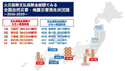都道府県別では、大阪府の支払額が6541億円で最も多く、「平成30年台風21号」と同年6月の「大阪府北部を震源とする地震」による被害の影響が大きい。次いで、「平成28年熊本地震」の被害が大きかった熊本県の約4048億円、「令和元年台風15号」の被害が大きかった千葉県・神奈川県・東京都が続く。