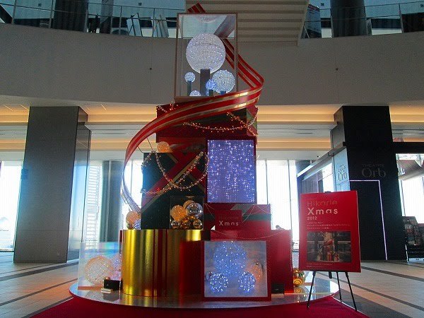 プレゼントボックスが積み重なった巨大なツリー。夜にはこのキラキラ感が増して、もっと綺麗なのでしょうね♪