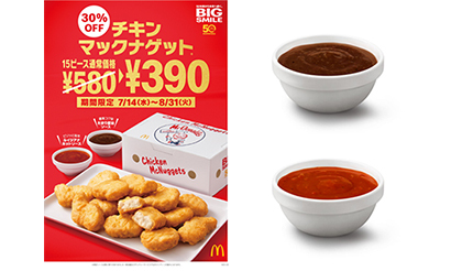 日本マクドナルドは7月14日に創業50周年キャンペーンの第2弾を開始。8月31日までの期間限定で「チキンマックナゲット 15ピース」を30%OFFで提供する。