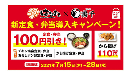全国の「はなまるうどん」「うまげな」「さぬき麺屋」「つるさく」他各店舗では7月15日から、「鶏千から揚げ」の新定食・弁当メニューとして「チキン南蛮定食・弁当」「おろしポン酢定食・弁当」の販売を開始。記念して7月15~28日まで、通常価格から100円引きになる「鶏千から揚げ新定食・弁当導入キャンペーン」を実施する。
