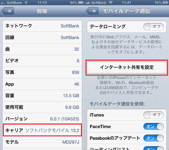 ■SoftBank版iPhone5でのテザリング利用事前準備