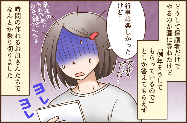 負担が偏れば保護者同士のトラブルを招く恐れもあり、もう少し園の協力がほしいところです。
